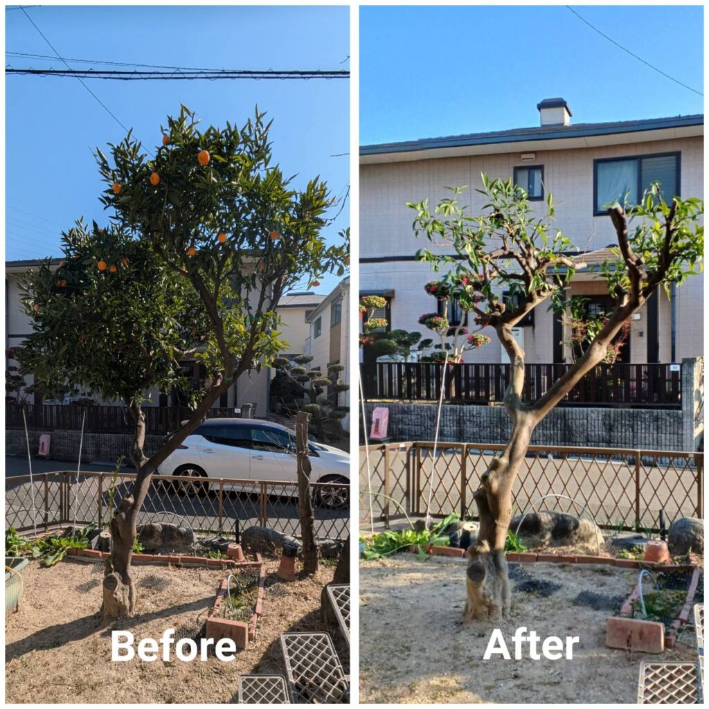 ミカン🍊の木を一部伐採しました(*^^*) 2026.02.04 リピーターのお客様からのご依頼です。 最近、カラスが飛んできてミカンをとって周りが汚れて困ってるのとの事。 スッキリさせていただきました。これで安心と喜んでいただきました。